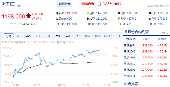 快讯:2025年7月24日,焦煤主力合约触及涨停,涨幅7.97%,报1198.5元/吨。